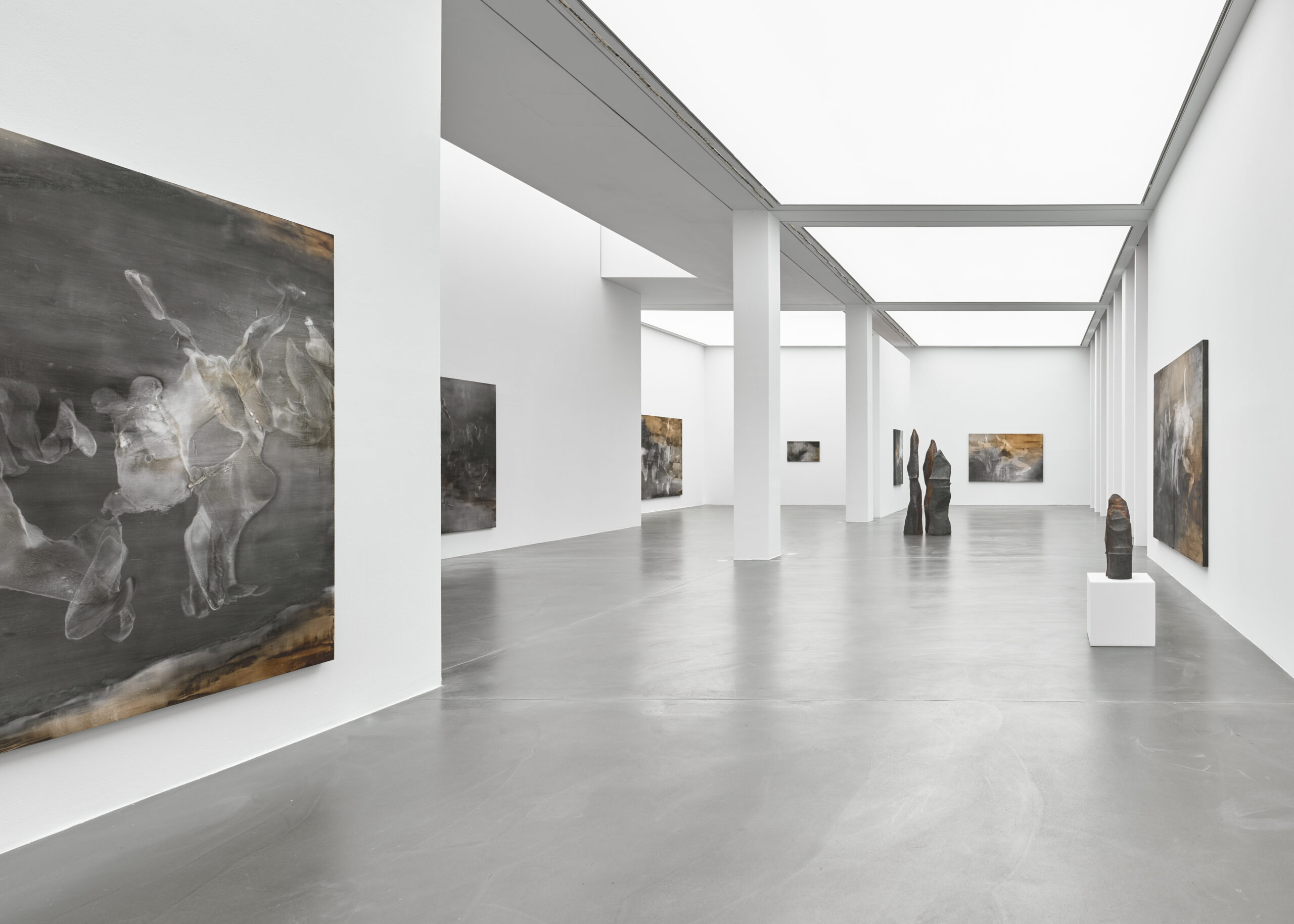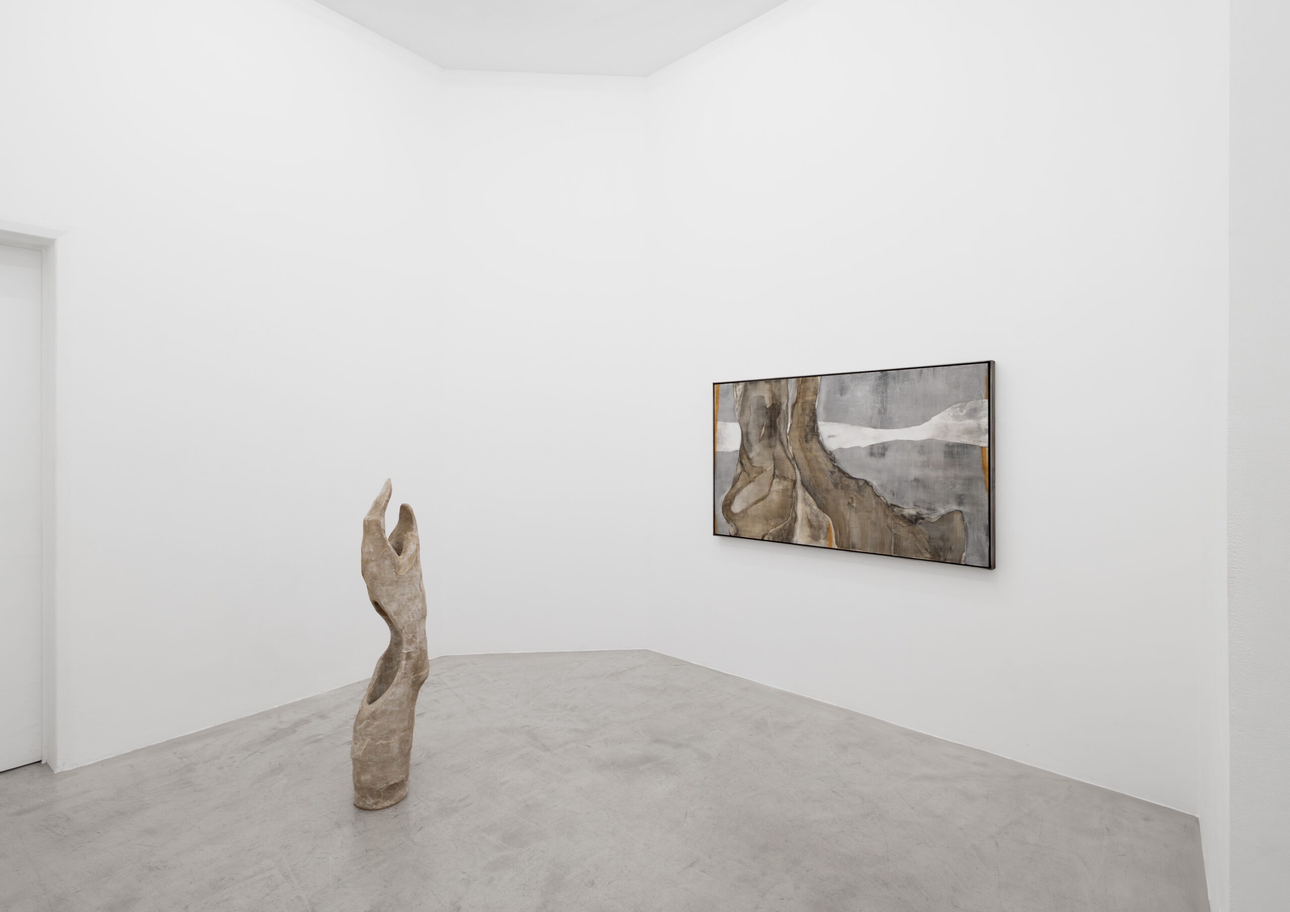 Aguirre’s works develop through an investigative process, where layers and nuances emerge gradually, shaping a narrative embedded in complex webs of meaning. These narratives do not adhere to linear or strictly rational structures, but instead bring alternative ways of belonging into being. Grounded by natural materials, such as sumi ink, charcoal, calcium, and shellac, the works evoke geographical and geological formations, where body parts and narrative clues emerge and dissolve. Through an autoethnographic lens, the entanglement of the human and natural world unfolds, revealing a myriad of expressions of belonging and generational memories of migration. The resulting landscapes resemble aerial views from a flight home, land extensively browsed on google maps, or cross sections of strata.